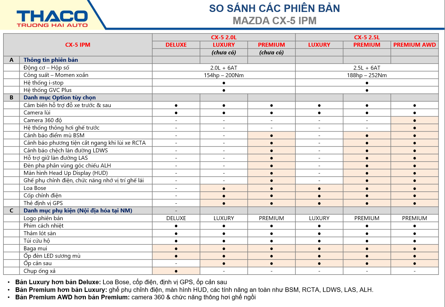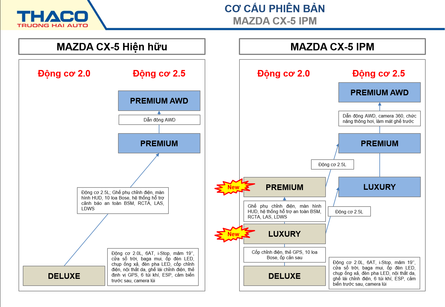 Mazda CX5 IPM mới được Thaco giới thiệu ra thị trường Việt Nam được trang bị 2 loại động cơ SkyActiv 2.0L và SkyActiv 2.5L. Với động cơ 2.0L, Thaco giới thiệu 3 phiên bản thay vì một phiên bản như mẫu xe hiện hữu, bao gồm 2.0L Deluxe, 2.0L Luxury, 2.0L Premium. Trong đó, phiên bản Luxury có thêm những trang bị tiện nghi và giải trí cao cấp; phiên bản Premium được trang bị hệ thống an toàn chủ động cao cấp i-Activsense.