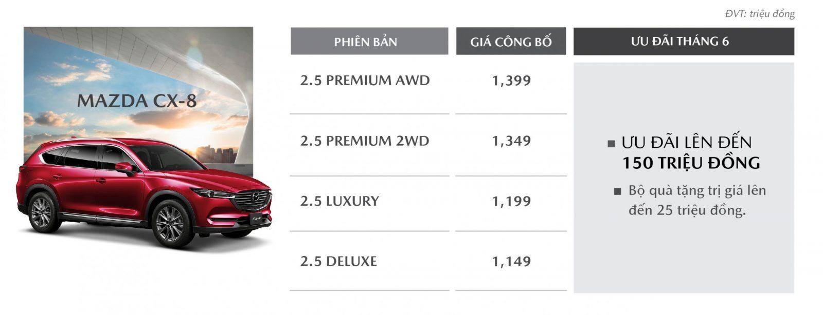 Mazda CX8 là mẫu SUV 7 chỗ được hưởng lợi nhiều nhất từ chương trình với ưu đãi lên đến 175 triệu. Cụ thể, phiên bản Mazda CX8 Premium AWD (2 cầu) được giảm giá trực tiếp 150 triệu đồng – cao nhất trong phân khúc ở thời điểm hiện tại; phiên bản Mazda CX8 Premium 2WD (1 cầu) giảm 140 triệu và phiên bản Mazda CX8 Luxury giảm 95 triệu đồng. Phiên bản Mazda CX8 Deluxe cũng được ưu đãi trực tiếp 110 triệu đồng, giúp khách hàng dễ dàng sở hữu ngay SUV 7 chỗ với giá chỉ 1.039 triệu đồng. Ngoài ra, khách hàng còn được Mazda Đà Nẵng tặng gói phụ kiện chính hãng trị giá 25 triệu đồng gồm phim cách nhiệt, thảm sàn, túi cứu hộ, riêng baga mui và ốp cản sau chỉ áp dụng trên phiên bản Premium và Luxury.