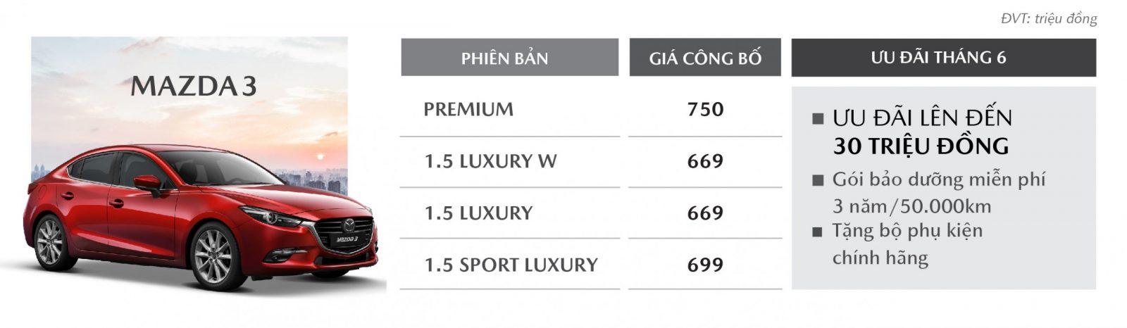 Bộ đôi đạt giải “Thiết kế xe đẹp nhất thế giới năm 2020” All-New Mazda 3 và All-New Mazda 3 Sport nhận gói ưu đãi lên đến 85 triệu đồng. Trong đó, toàn bộ các phiên bản All-New Mazda 3 Sport đồng loạt giảm giá trực tiếp 60 triệu; All-New Mazda 3 phiên bản 1.5L Premium và Luxury được giảm 55 triệu đồng và các phiên bản All-New Mazda 3 còn lại ưu đãi từ 30 – 50 triệu đồng; Mazda Đà Nẵng tặng kèm gói phụ kiện chính hãng trị giá 25 triệu đồng áp dụng theo từng phiên bản và mẫu xe cụ thể.